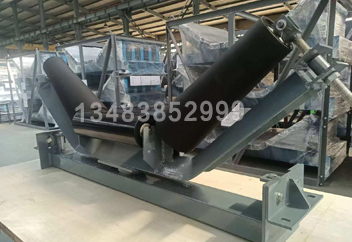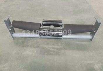 雙中輥調偏托輥組回轉軸焊在下橫梁上,回轉總成包括組合軸承、回轉軸套)安裝在下橫梁上,回轉總成外圍設計了可擺動的中托輥橫梁以回轉軸為中心,在運行膠帶前、后中托輥橫梁各設置一個中托輥形成以回轉軸為中心的平衡支撐。側托輥采用加大軸承和軸徑設計,用側托輥軸代替常規(guī)的側托輥橫梁功能。側托輥可拆卸的安裝在兩中輥中間。側托輥為錐形輥設計,錐形輥采用鑄橡膠結構,其在膠帶跑偏時能產生較大的回向阻尼效果,從而使膠帶居中平穩(wěn)運行。